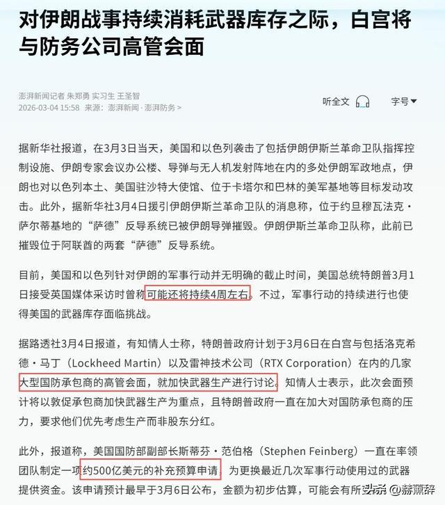 五角大楼已紧急申请约500亿美元的额外拨款,用于填补战损的军火库,这些真金白银最终都要由美国民众买单。